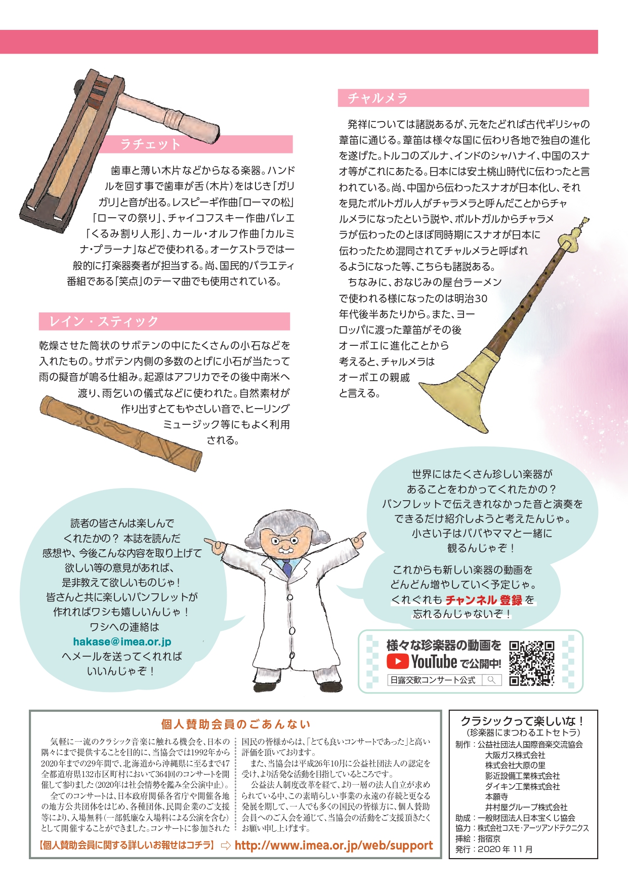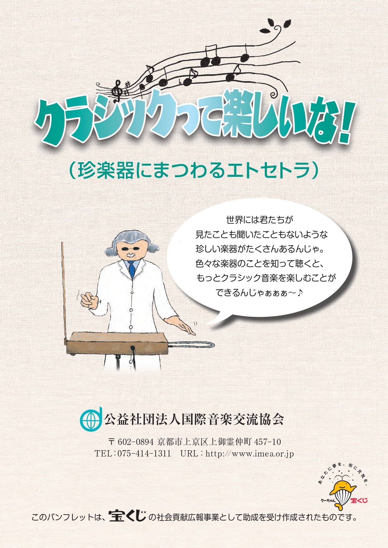 さて、当協会はこの度、「クラシックって楽しいな!(珍楽器にまつわるエトセトラ)」を発行致しましたのでご報告申し上げます。同パンフレットは、より多くの国民の皆様にクラシック音楽を身近に感じて頂くことを目的に、宝くじの社会貢献広報事業(令和2年度)として一般財団法人日本宝くじ協会より助成を受け作成されたものです。