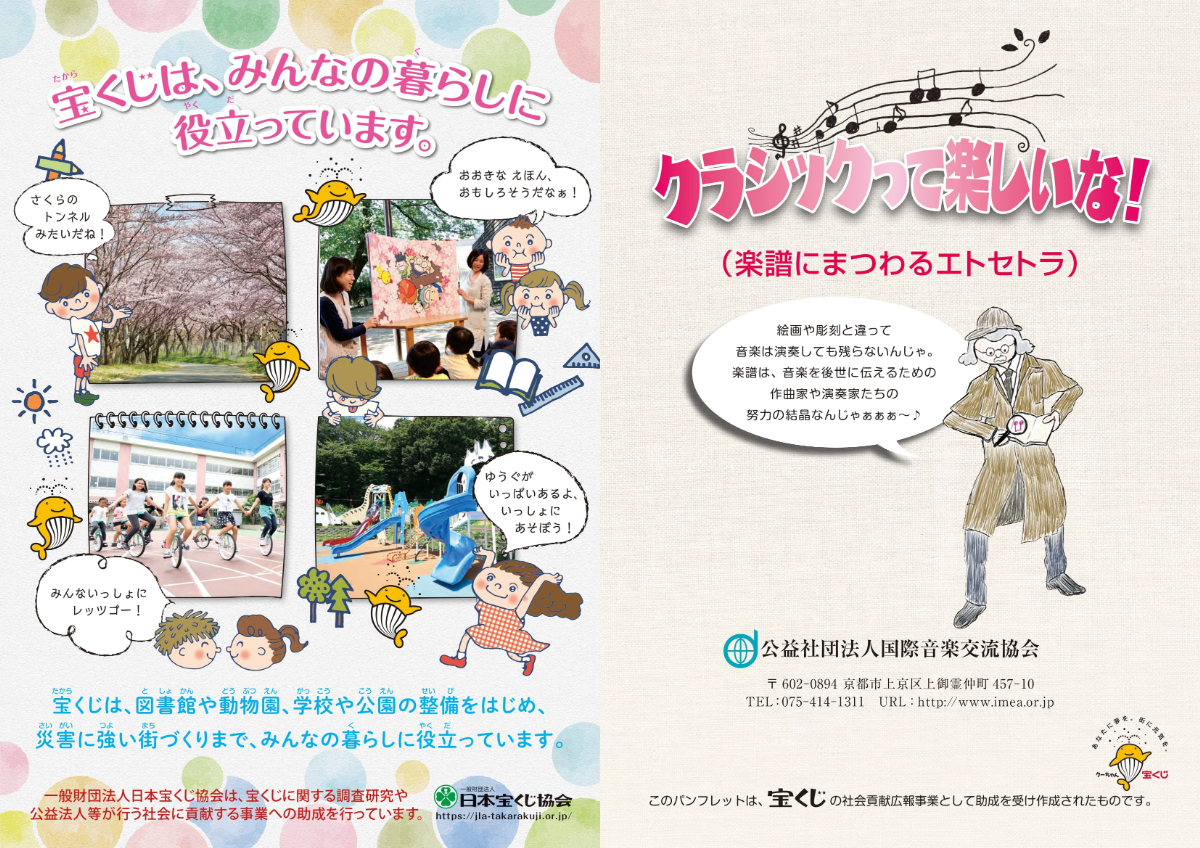 さて、当協会はこの度、「クラシックって楽しいな!(楽譜にまつわるエトセトラ)」を発行致しましたのでご報告申し上げます。同パンフレットは、より多くの国民の皆様にクラシック音楽を身近に感じて頂くことを目的に、宝くじの社会貢献広報事業(令和3年度)として一般財団法人日本宝くじ協会より助成を受け作成されたものです。