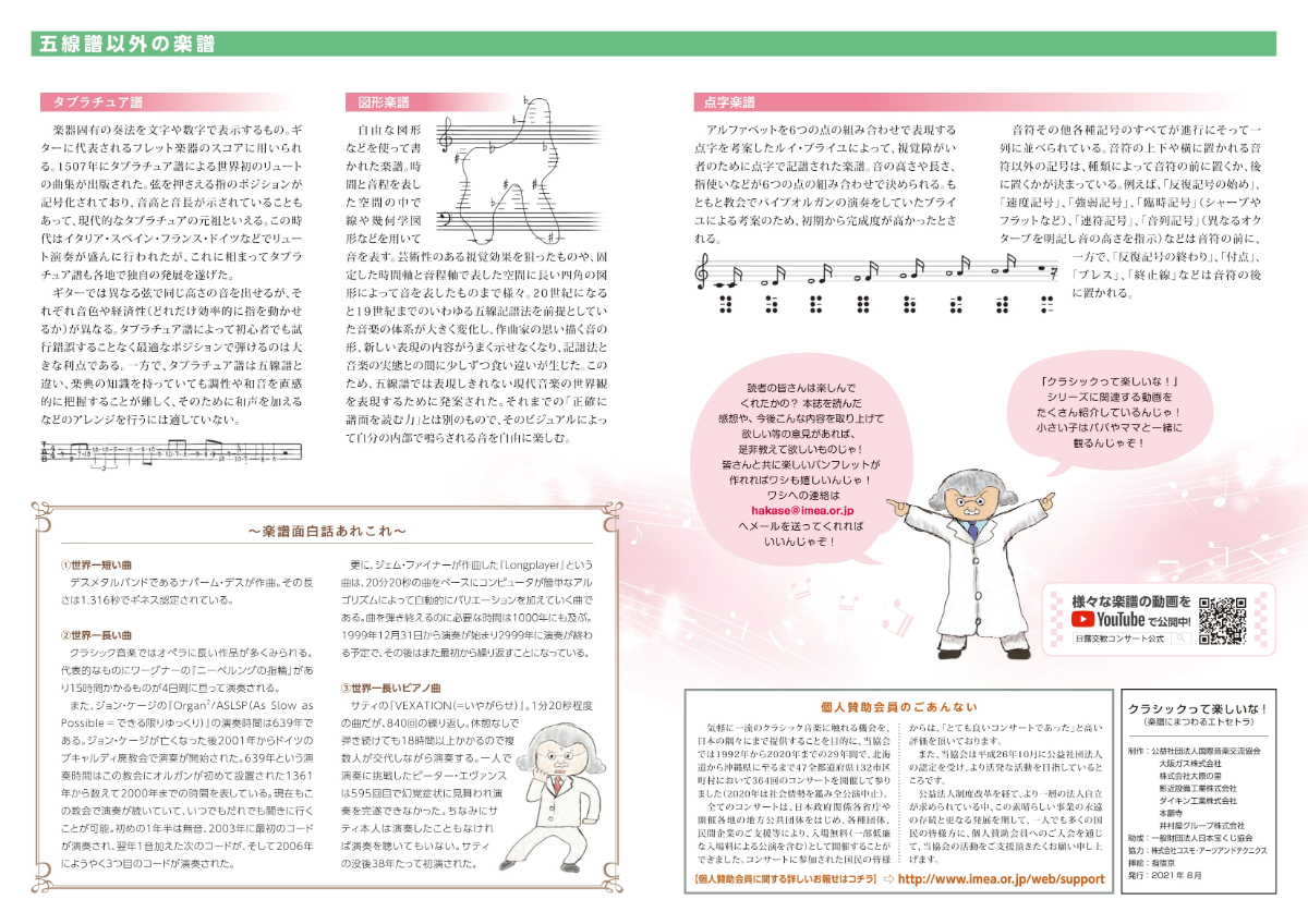尚、「クラシックって楽しいな!(楽譜にまつわるエトセトラ)」は、日本全国約1250箇所の主要音楽ホールに各200部ずつ(計25万部)送付され無料配布しております。また、当協会主催コンサートの会場でも、来年度以降も継続して配布される(計5万部)予定です。各会場でお気軽に入手の上ご覧頂ければ有難く存じます。