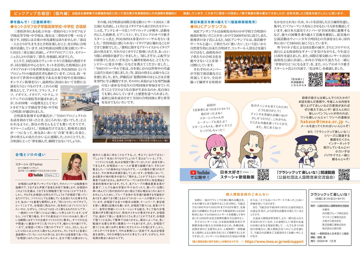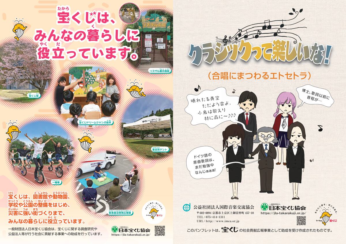 さて、当協会はこの度、「クラシックって楽しいな!(合唱にまつわるエトセトラ)」を発行致しましたのでご報告申し上げます。同パンフレットは、より多くの国民の皆様にクラシック音楽を身近に感じて頂くことを目的に、宝くじの社会貢献広報事業(令和6年度)として一般財団法人日本宝くじ協会より助成を受け作成されたものです。