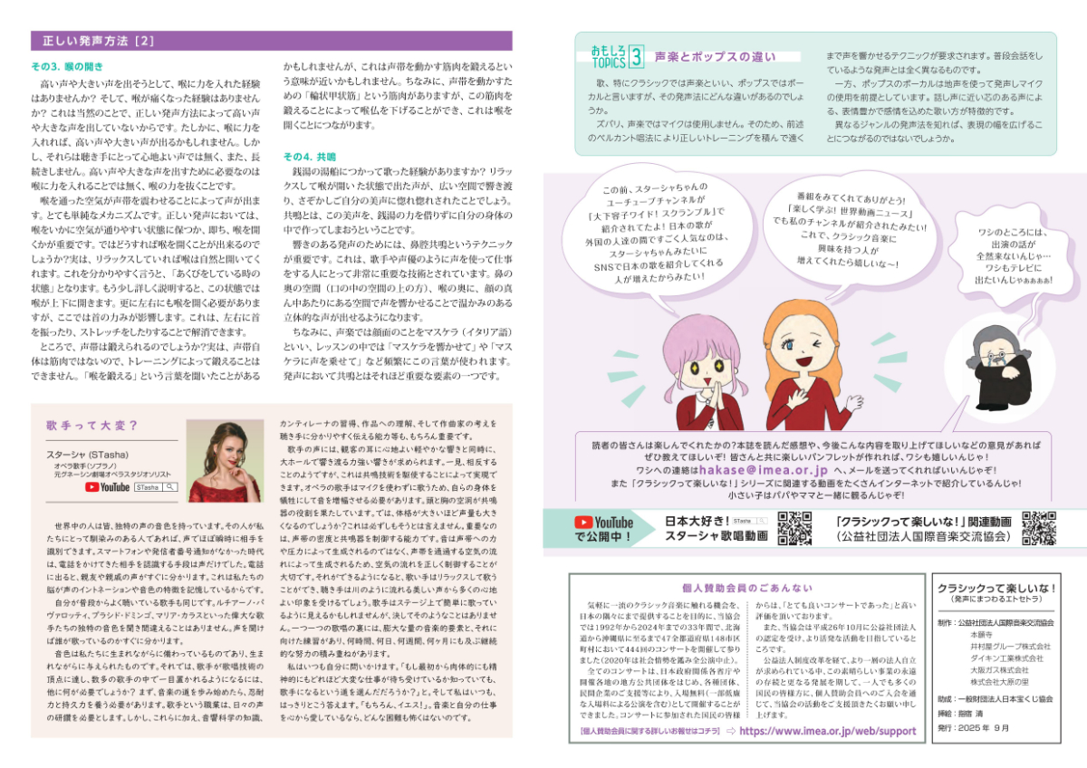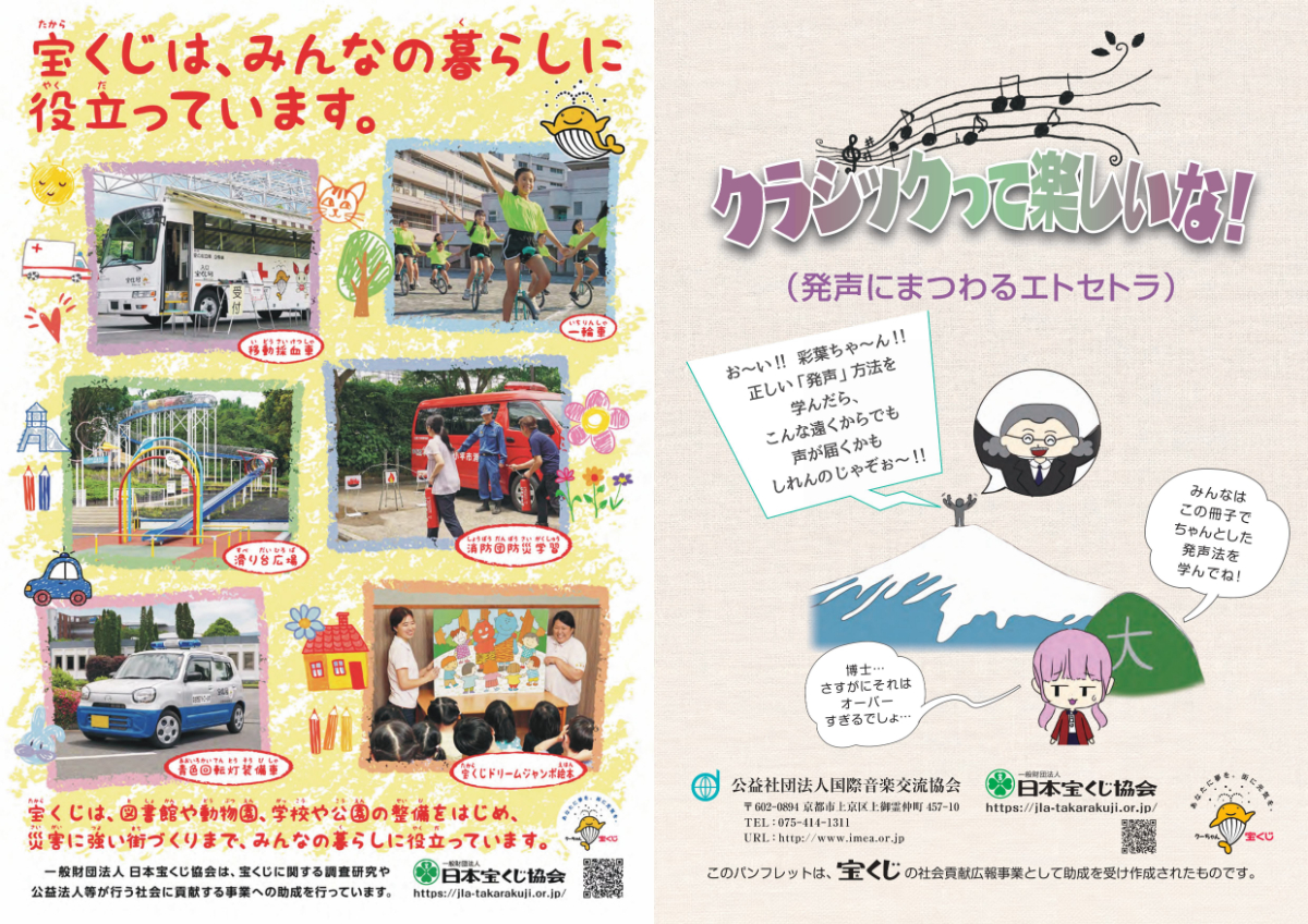 さて、当協会はこの度、「クラシックって楽しいな!(発声にまつわるエトセトラ)」を発行致しましたのでご報告申し上げます。同パンフレットは、より多くの国民の皆様にクラシック音楽を身近に感じて頂くことを目的に、宝くじの社会貢献広報事業(令和7年度)として一般財団法人日本宝くじ協会より助成を受け作成されたものです。