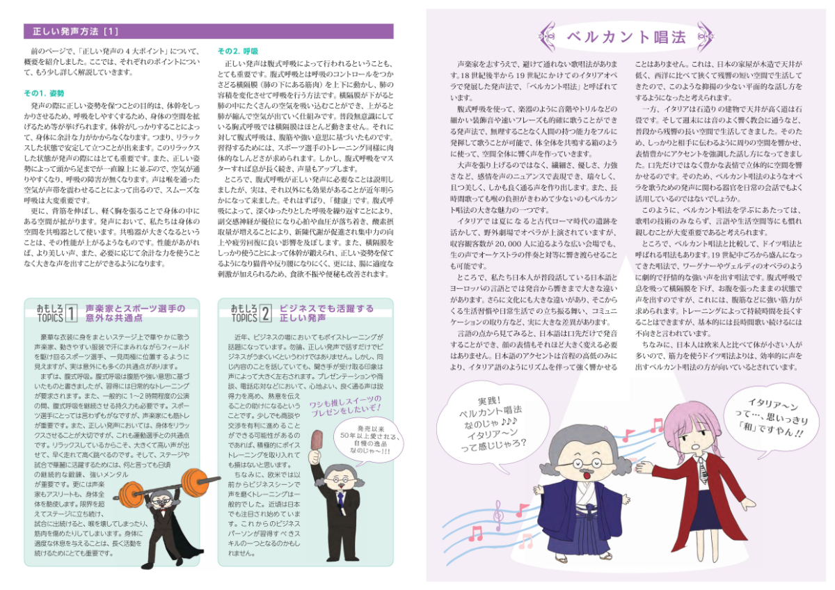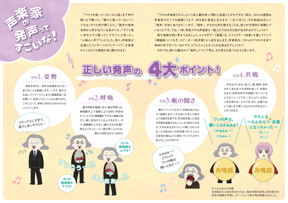 尚、「クラシックって楽しいな!(発声にまつわるエトセトラ)」は、日本全国約1250箇所の主要音楽ホールで無償配布(計27.5万部)しております。また、当協会主催コンサートの会場等でも無償配布(計5.5万部)致します。各会場でお気軽に入手の上ご覧頂ければ有難く存じます。
